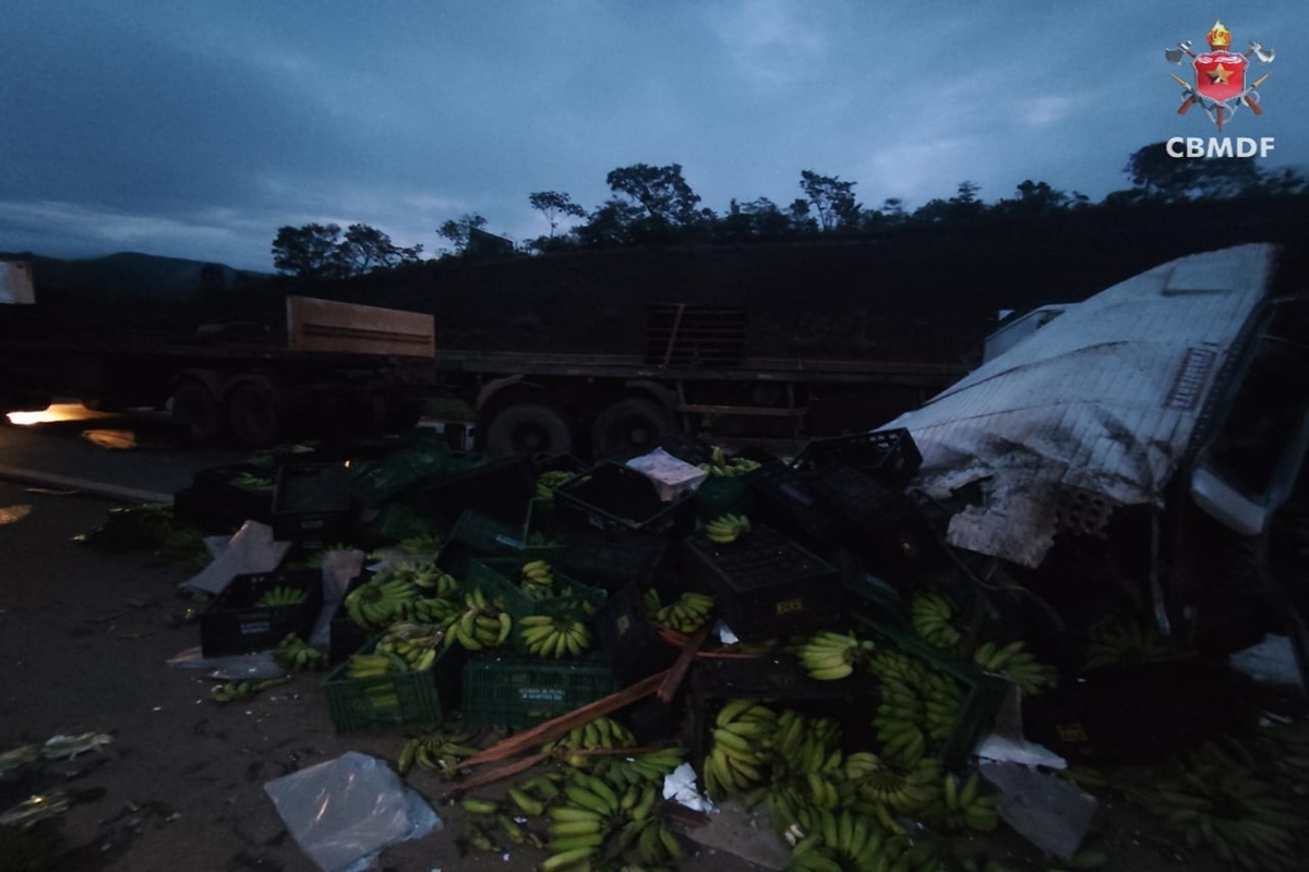 O acidente principal envolveu uma carreta que carregava bananas, que trafegava no sentido Brasília. O motorista perdeu o controle do veículo, invadiu o canteiro central e colidiu de frente com outra carreta que seguia na direção oposta. O impacto causou ferimentos significativos em ocupantes: o condutor da primeira carreta registrou uma semi?amputação no braço esquerdo, enquanto o passageiro sofreu uma fratura na perna direita. O motorista da segunda carreta não se feriu. As vítimas foram encaminhadas para unidades de saúde, conscientes e orientadas, conforme informações do Corpo de Bombeiros Militar do Distrito Federal (CBMDF).