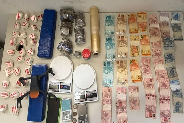 As buscas realizadas no imóvel do suspeito levaram à localização de uma quantidade expressiva de drogas e de materiais vinculados ao tráfico. No total, foram apreendidos 2,674 kg de maconha, 0,712 kg de cocaína e 0,024 kg de crack, além de uma motocicleta, quatro balanças de precisão, dinheiro em espécie, cadernos com anotações, um aparelho celular, um drone e outros itens usados para a prática criminosa.