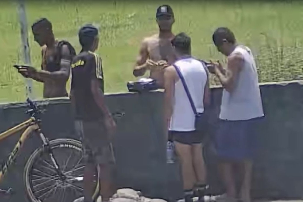 1 de 1 Foto colorida de traficantes comercializando drogas em frente a um campo de futebol, em Cubatão. – Foto: Polícia Civil/Divulgação.
