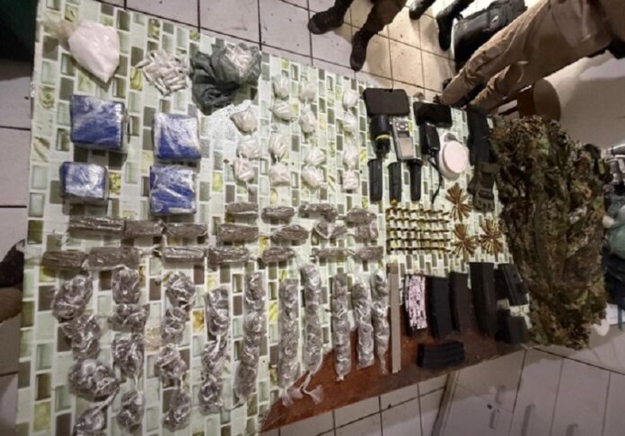 Drogas: 221 buchas de maconha (pequena); 78 buchas de maconha (média); 18 buchas de maconha (grande); 713 gramas de maconha em tablete; 55 gramas de cocaína em pacote; 401 pinos de cocaína.