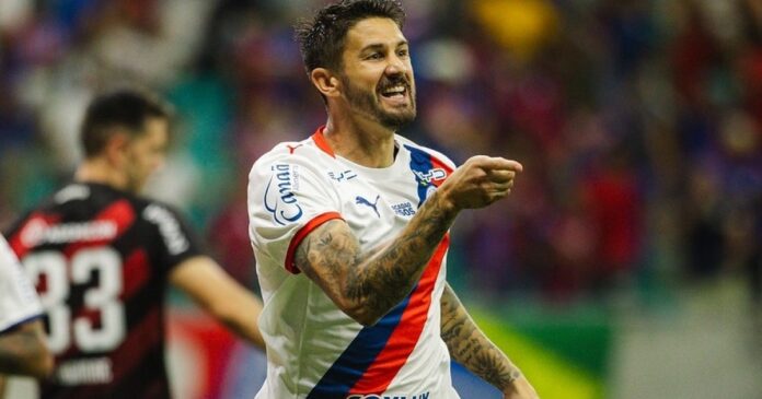 Resumo: O Bahia goleou o Athletico-PR por 3 a 0 na Fonte Nova, com Everaldo marcando duas vezes. O jogo ficou marcado por uma penalidade anulada após revisão do VAR, provocando reclamações do atacante. O time baiano trabalha agora para o duelo contra o Palmeiras, pela 10ª rodada do Brasileirão.