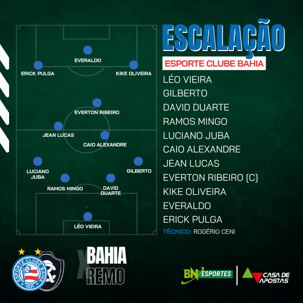 Bahia: Léo Vieira; Gilberto, Ramos Mingo, David Duarte e Luciano Juba; Jean Lucas, Caio Alexandre e Everton Ribeiro; Erick Pulga, Kike Oliveira e William José. Técnico: Rogério Ceni.